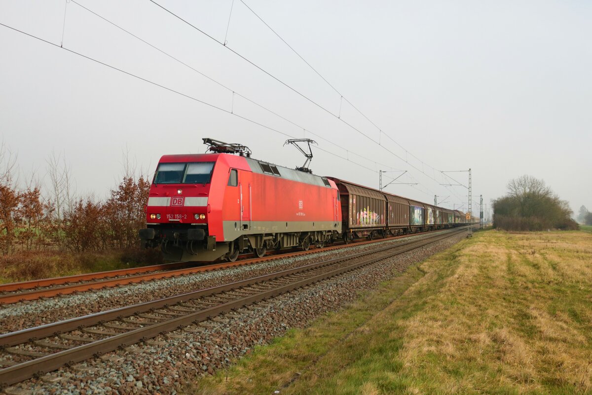 DB Cargo 152 158-2 mit einen Mischer in Altheim bei Dieburg (Hessen) am 22.02.23