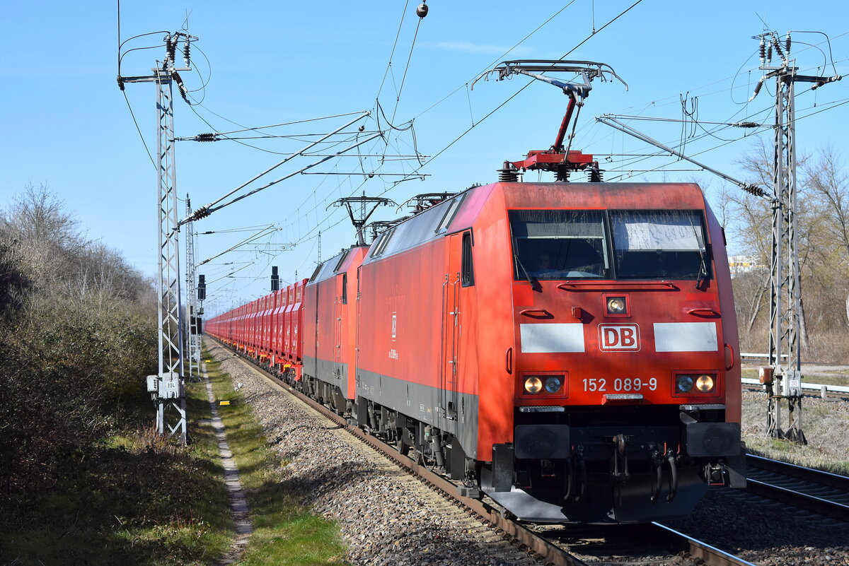 DB Cargo AG [D] mit der Doppeltraktion "152 089-9" [NVR-Nummer: 91 80 6152 089-9 D-DB] + "152 045-1" [NVR-Nummer: 91 80 6152 045-1 D-DB] mit dem Erzzug aus Hamburg Richtung Ziltendorf EKO am 16.03.23 Durchfahrt Bahnhof Berlin-Hohenschönhausen.
