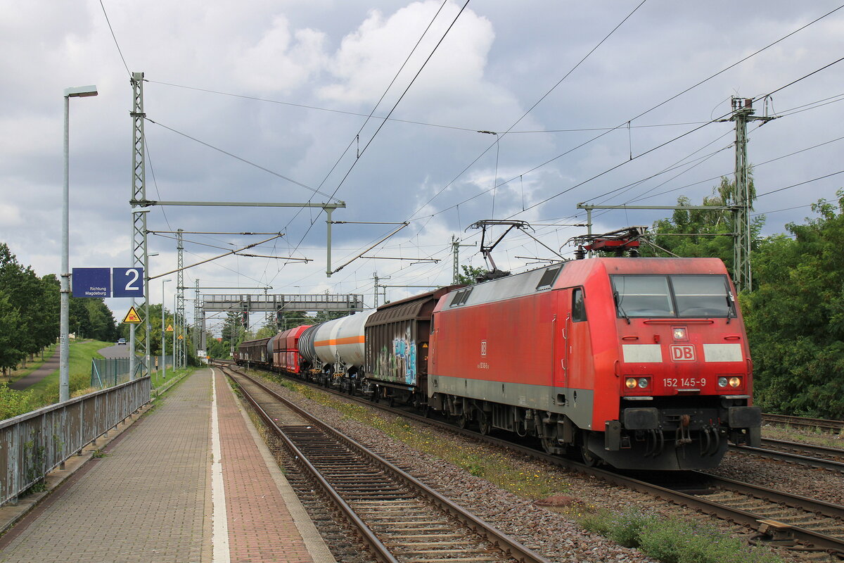 DB 152 145-9 mit einem gemischten Güterzug Richtung Magdeburg, am 04.08.2023 in Niederndodeleben.
