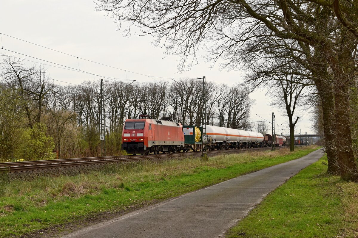 DB Cargo 152 090-7 mit gemischtem Güterzug EZ 51271 Hagen-Vorhalle Vof - Maschen Rbf (bei Lembruch, 27.03.2024).