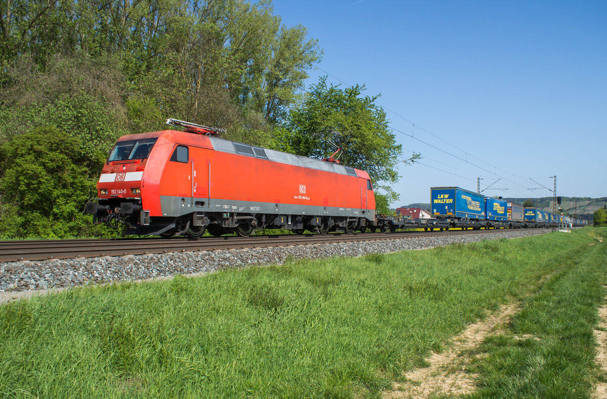 152 140-0 der DB ist mit einem Aufliegerzug bei Himmelstadt gesehen am 30.04.2024.