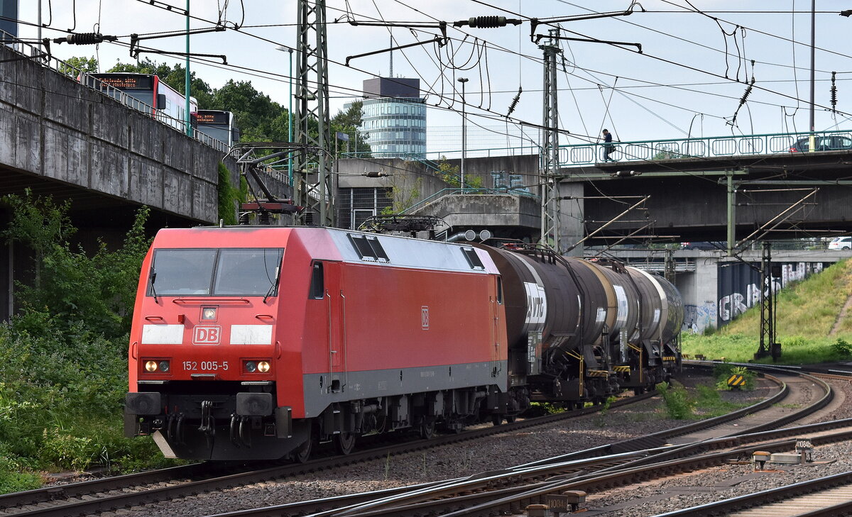 DB Cargo AG, Mainz mit ihrer "152 005-5" [NVR-Nummer: 91 80 6152 005-5 D-DB] verlässt mit einem Kesselwagenzug den Hamburger Hafen am 21.05.24 Höhe Bahnhof Hamburg-Harburg.