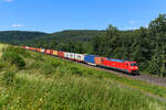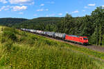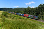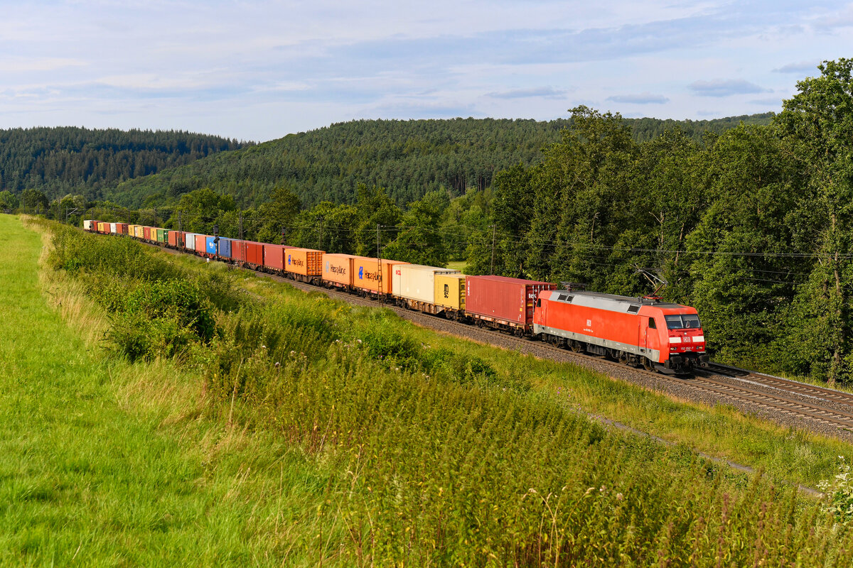 Mit einem relativ kurzen Containerzug - üblich sind Längen bis zu 700 Metern - war die 152 052 am 25. Juli 2024 auf der Nord-Süd-Strecke unterwegs. Bei Bernhards vor den Toren Fuldas konnte ich die Leistung dokumentieren.