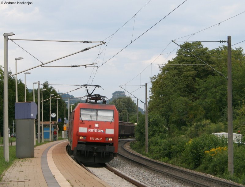 152 002-2 mit einem Mischer (Lok fährt bis Singen) bei der Durchfahrt Singen-Landesgartenschau am 11.8.08