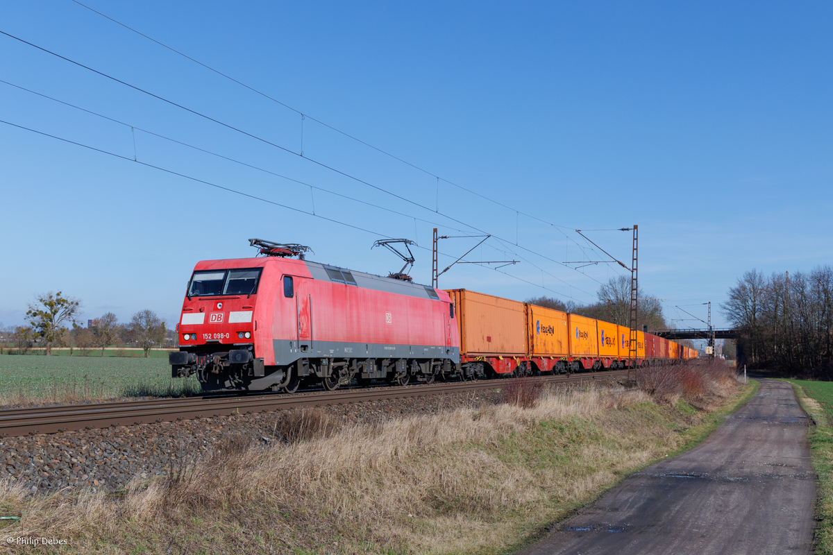 152 146 schleppte am 15.02.26 den DHL-Containerzug durch Brehna Richtung Halle(S).