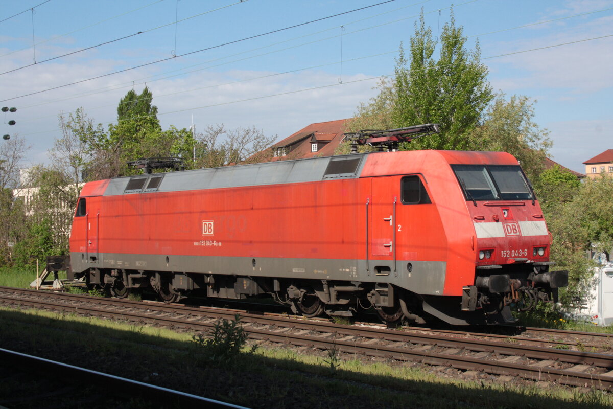 152 043-6 stand am 16.04.2026 im Bahnhof Kehl, mit einem noch erkennbaren DB Cargo Logo hinter dem DB Logo.