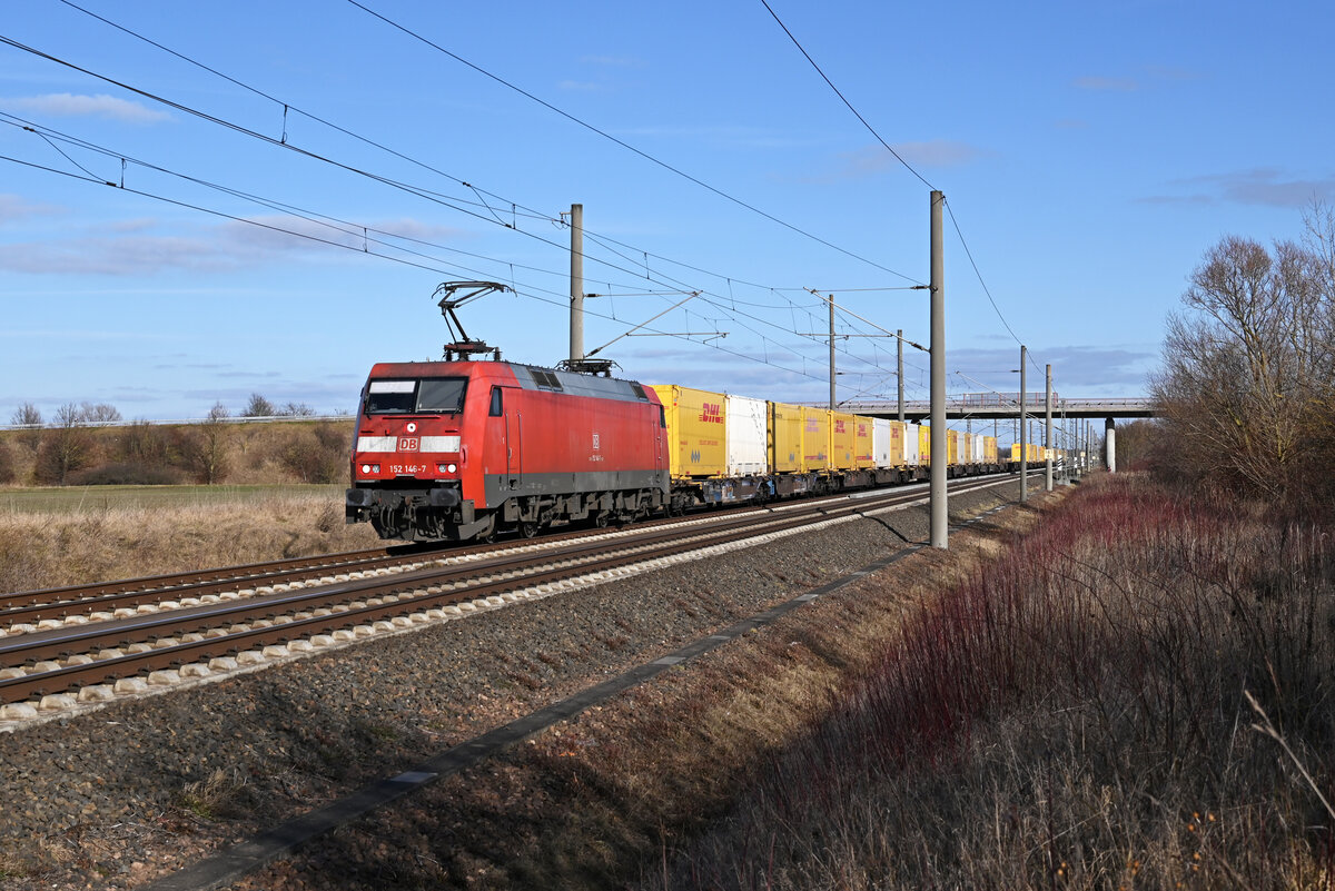 152 146 schleppte am 15.02.26 den DHL-Containerzug durch Brehna Richtung Halle(S).