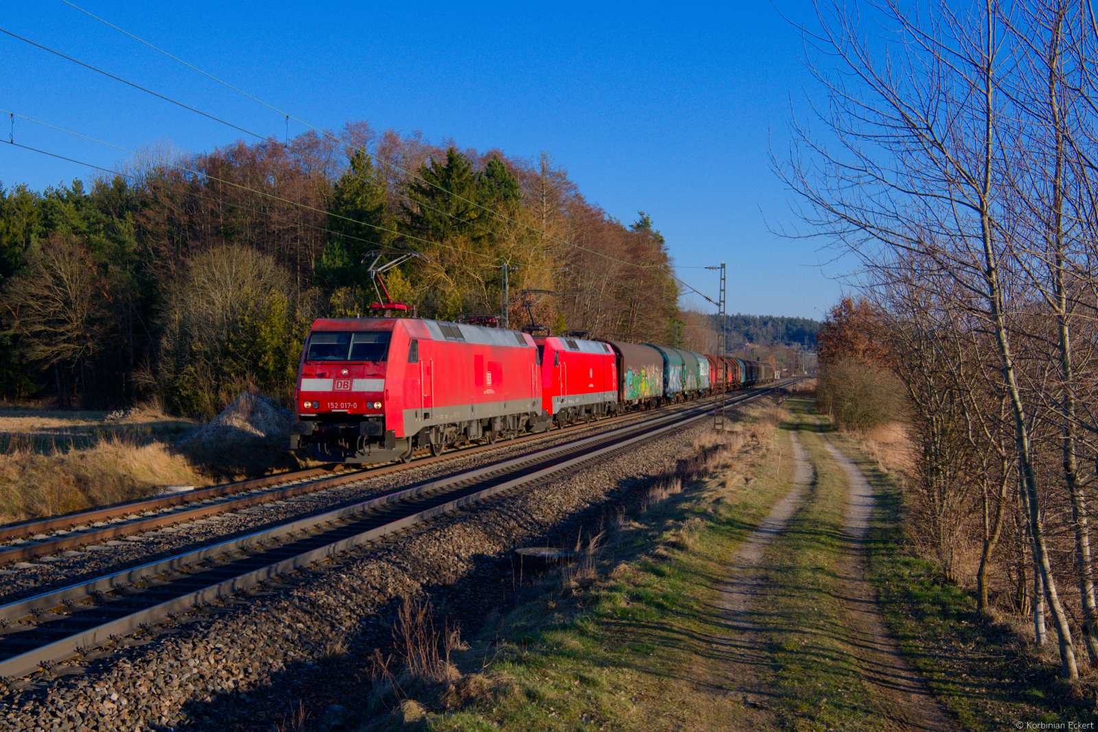152 152-5 und eine weitere 152 ziehen am 05. März 2014 einen gemischten Güterzug durch Kronach in Richtung Saalfeld.