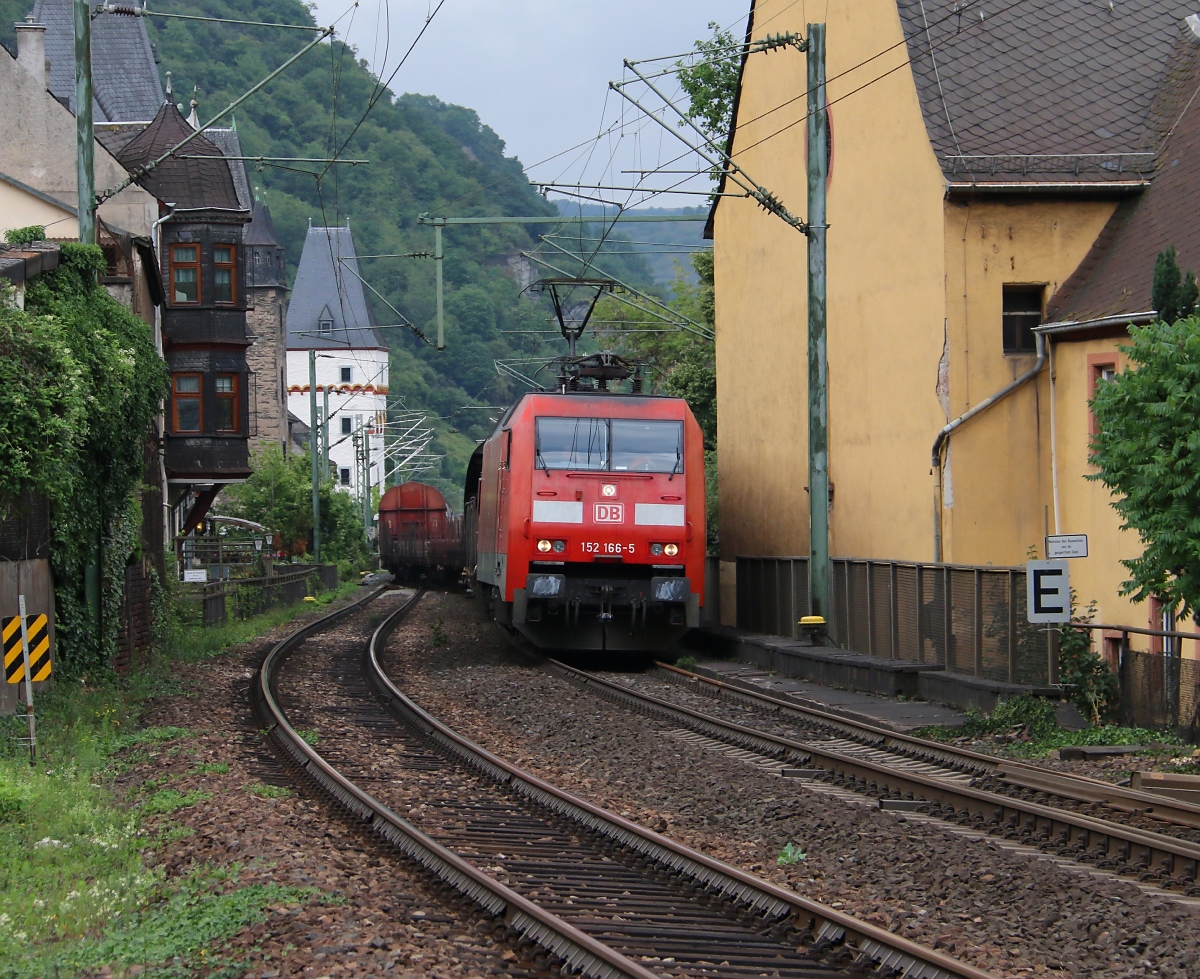 152 166-5 mit gemischtem Güterzug in Richtung Süden bei einer Weichenfahrt vor dem Bahnhof Bacharach. Aufgenommen am 12.07.2014.