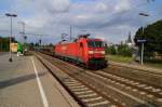 152 036-0 (Siemens ES64F) zieht bunt gemischte Fracht über die Leipziger Chaussee (B 6) in Halle (Saale) Richtung Abzweig Thüringer Bahn.
