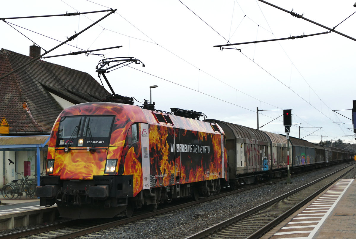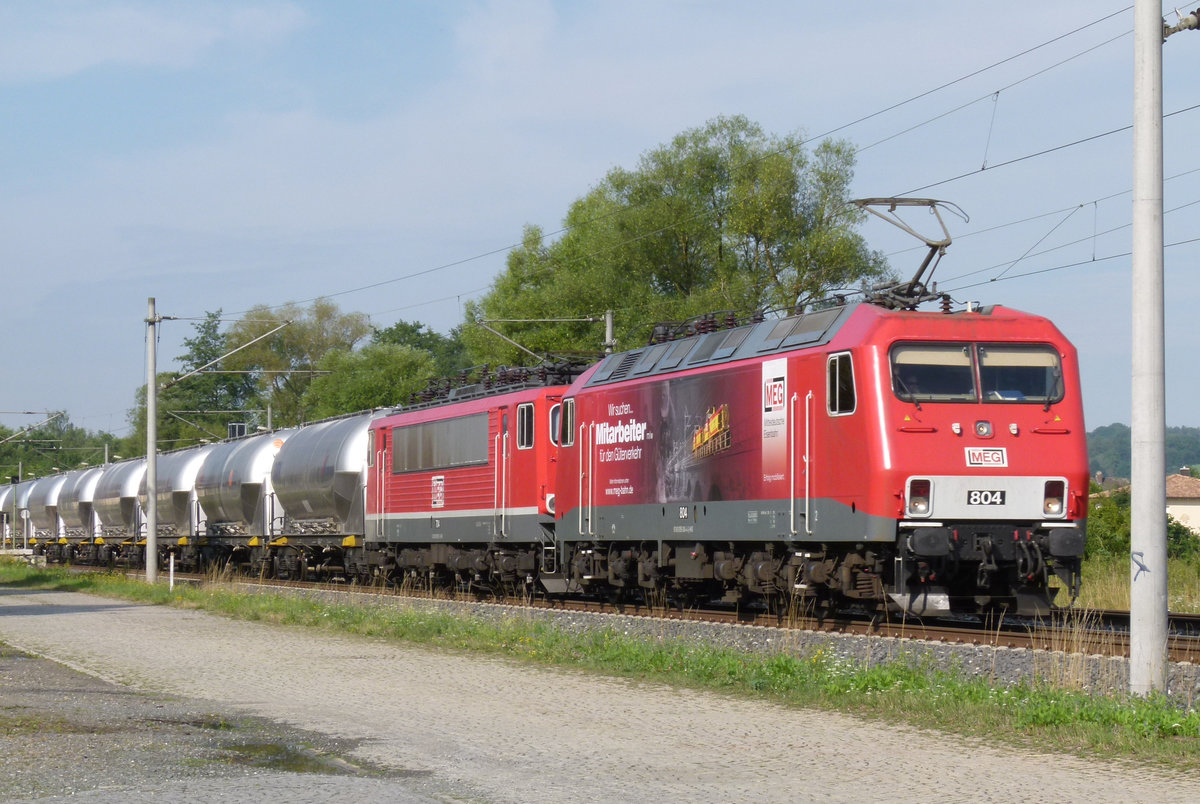 23. Juli 2015, Ein Kesselwagenzug mit zwei Loks der MEG fährt in Richtung Saalfeld durch den Haltepunkt Küps. Die Zuglok ist ex DR 156 004, gebaut 1991 bei AEG in Hennigsdorf. Die zweite Lok ist MEG 704 (ex DR 155 195, LEW 1983) ) . Jürgen Krause