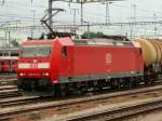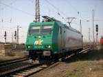 Näherer Blick auf 185 409-0, die mit Schwenkdachwagen voller Dünger durch Hohenthurm Richtung Halle (Saale) rollt.