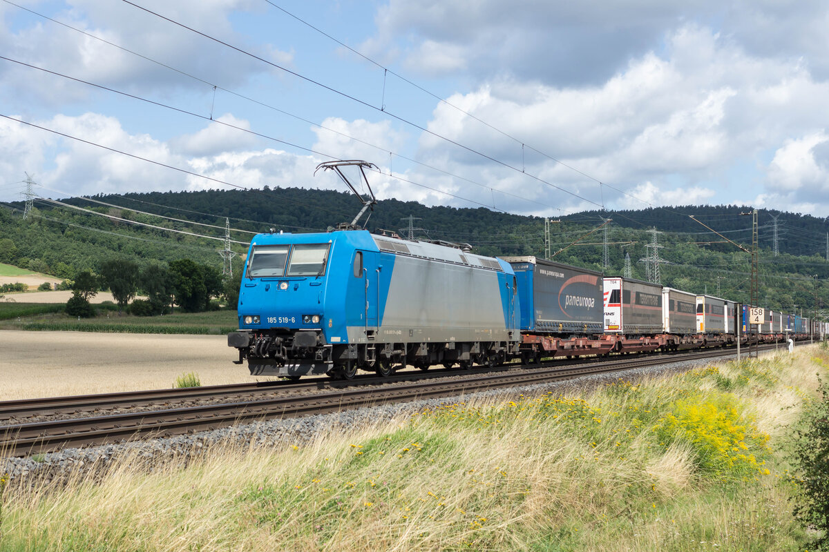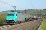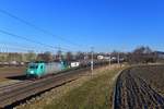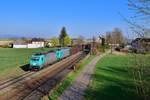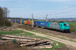 185 575 war am 21. April 2021 mit einem Holzzug bei Niederaudorf im Inntal in Richtung Kufstein unterwegs.