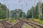 Unter den wachsamen Augen des Fahrdienstleiters im Stellwerk B2 zieht 185 611-1 am 27.04.2025 ihren Kesselzug in den Bahnhof Wiesenburg.