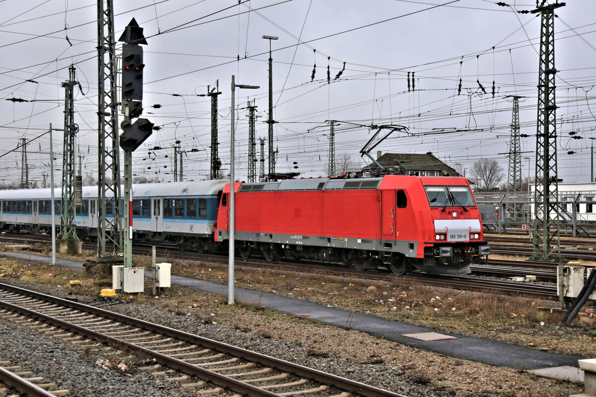 185 535-2 von Crossrail rangiert in Aachen-West und im Hintergrund steht 145 CL-031 von Alpha Trains auf dem abstellgleis in Aachen-West bei strömenden Regen am 8.2.2014.