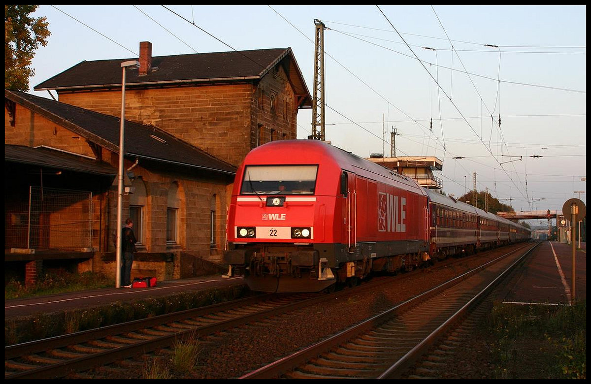 Der Hercules WLE 22 kommt hier am 7.10.2007 um 18.20 Uhr mit dem Euro Express Partyzug DLR 80084 nach Köln in der Abendsonne durch den Bahnhof Hasbergen.