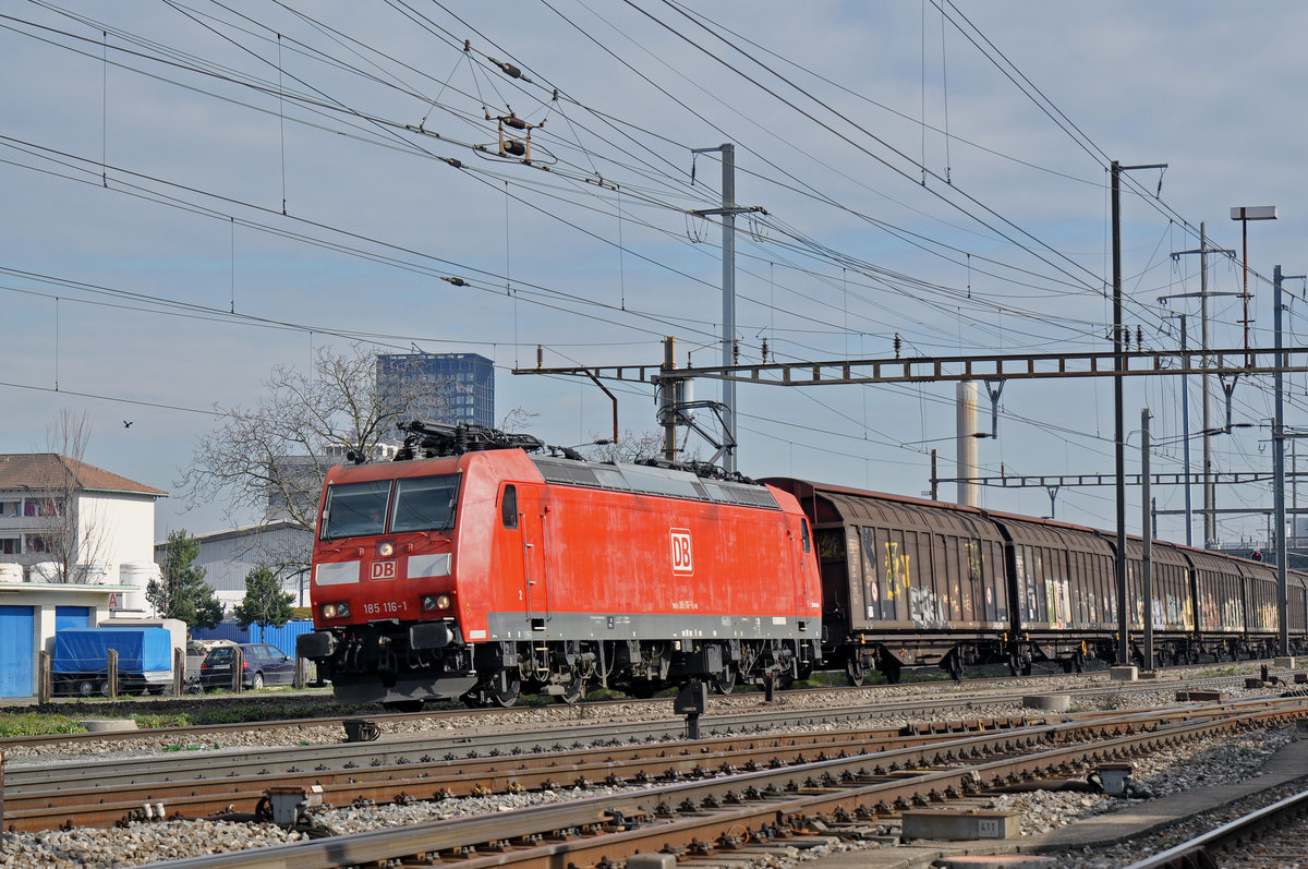 DB Lok 185 116-1 durchfährt den Bahnhof Pratteln. Die Aufnahme stammt vom 14.02.2018.