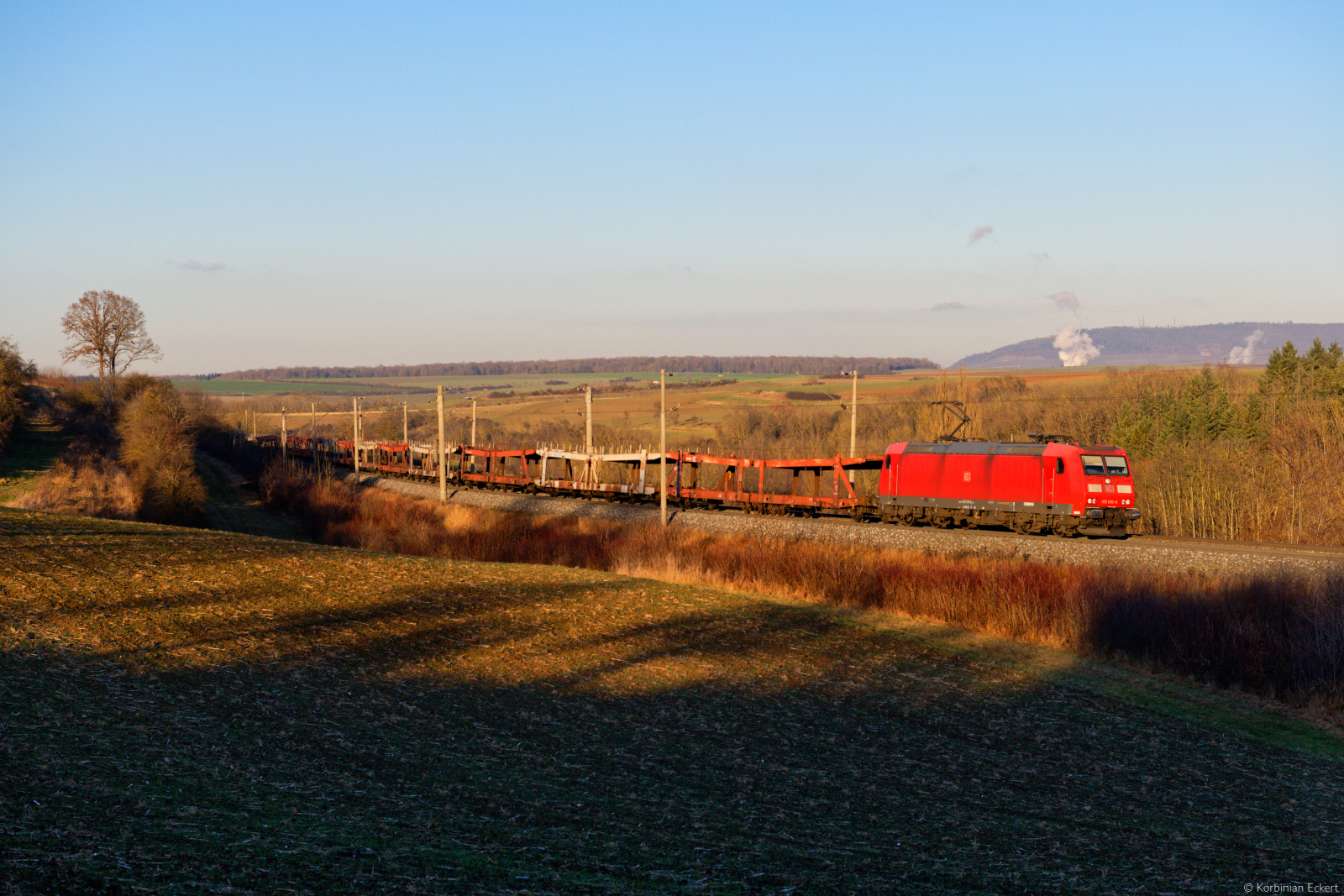 DB 185 348-0 mit Rungenwagen (Stahltransport), aus Freilassing kommend, bei Niederstraß, am 9. Dezember 2025.