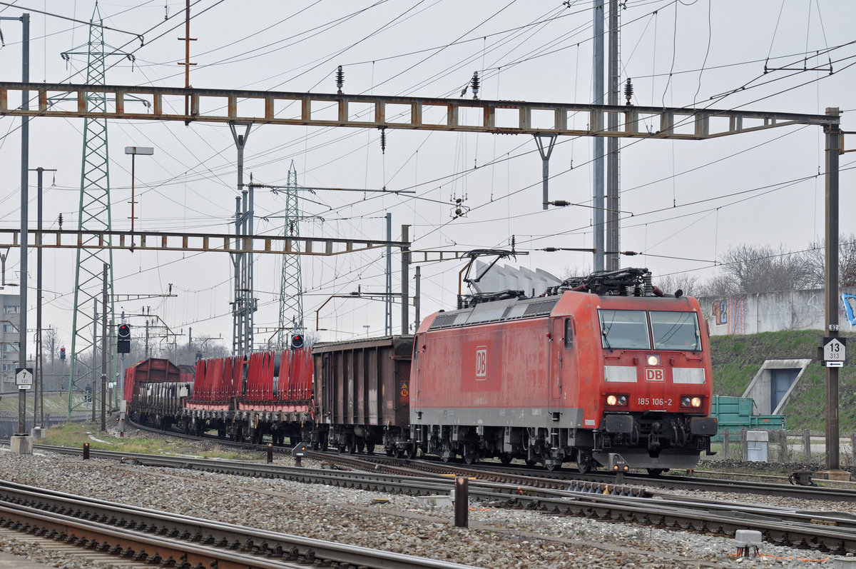 DB Lok 185 106-2 durchfährt den Bahnhof Pratteln. Die Aufnahme stammt vom 20.03.2018.