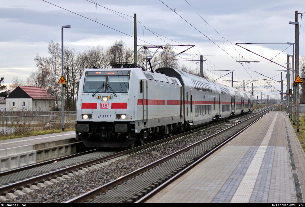 185 081-7 DB als DPE 1895 (Eishockeysonderzug der Schienenverkehrsgesellschaft mbH (SVG)) von Mannheim Hbf nach Berlin Ostbahnhof, mit einer stattlichen Länge von 14 Wagen bzw. 386 m, durchfährt den Hp Hohenthurm auf der Bahnstrecke Berlin–Halle (KBS 250).
