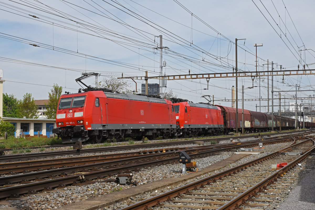 Doppeltraktion, mit den DB Loks 185 105-4 und 185 094-0, durchfährt den Bahnhof Pratteln. Die Aufnahme stammt vom 21.04.2020.