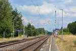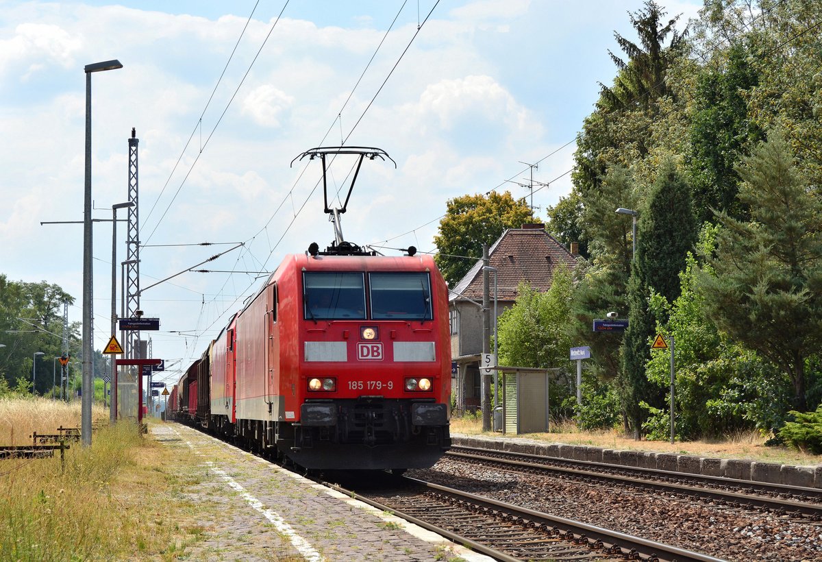 185 179-9 hat mit ihrem Güterzug die Steigung nach Medewitz bezwungen und fährt nun durch Medewitz weiter gen Wiesenburg nach Seddin.