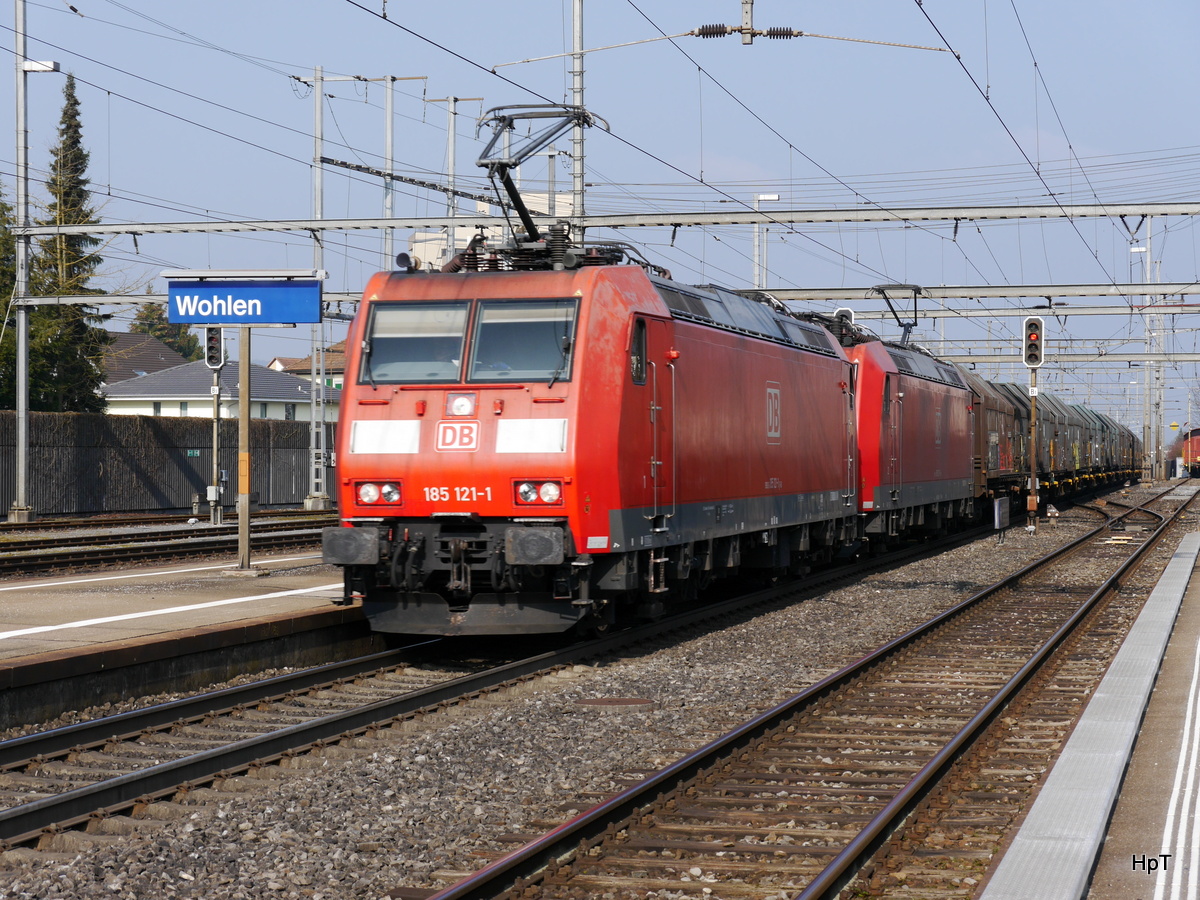 DB - Loks 185 121-1 und 185 127-8 mit Güterzug bei der durchfahrt im SBB Bahnhof Wohlen AG am 11.03.2016