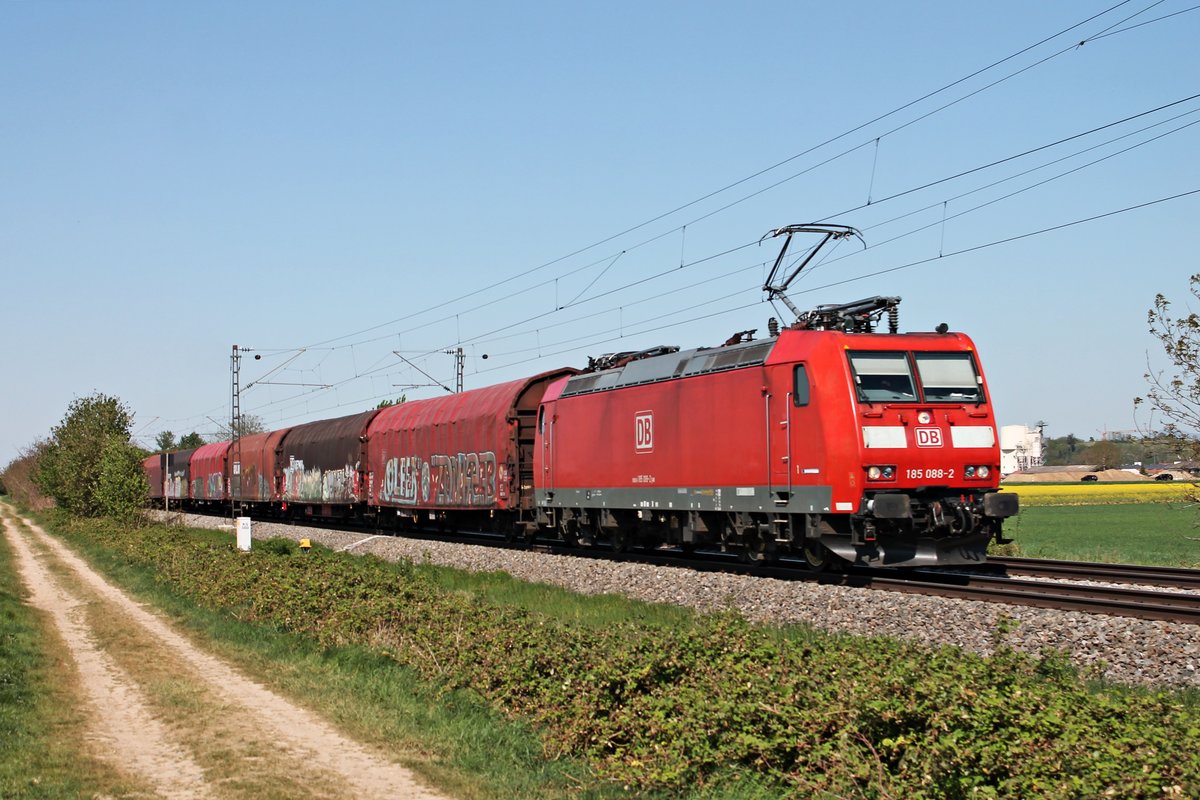 Mit dem EZ 44601 (Kehl - Basel SBB RB) fuhr am Nachmittag des 22.04.2020 die 185 088-2 südlich von Buggingen über die KBS 702 durchs Markgräflerland in Richtung Schweiz.