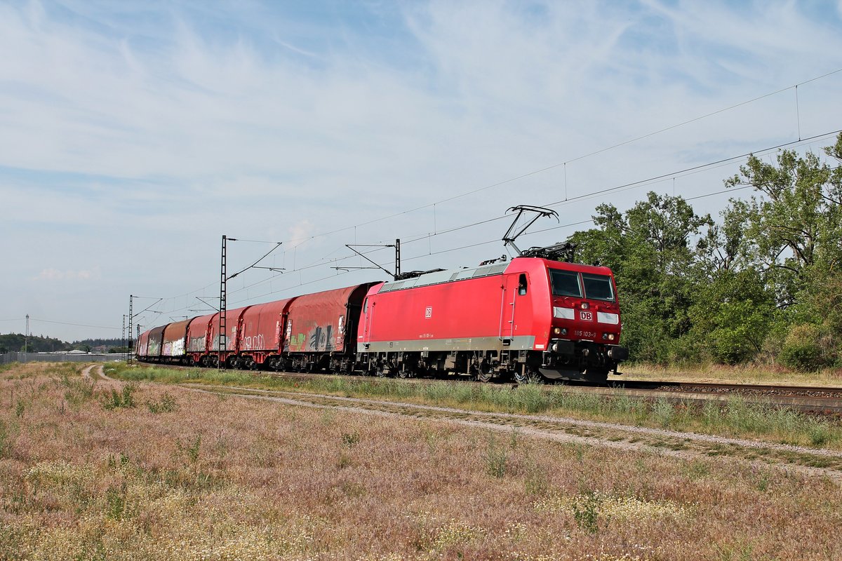 Mit dem EZ 45002 (Chiasso Smistamento - Mannheim Rbf) fuhr am Morgen des 03.06.2020 die 185 103-9 nördlich von Waghäusel über die Rheintalbahn in Richtung Neulußheim.