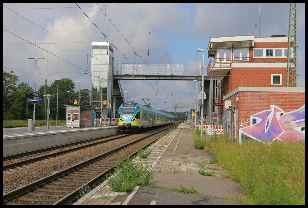 DB 185386-3 erreicht hier mit einem gemischten Güterzug am Haken auf der Fahrt in Richtung Osnabrück am 11.5.2021 um 13.51 Uhr den Bahnhof Lengerich.