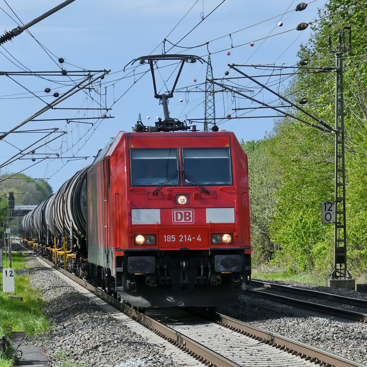 Die Elektrolokomotive 185 214-4 zog Anfang Mai 2021 einen Kesselzug durch Lintorf.