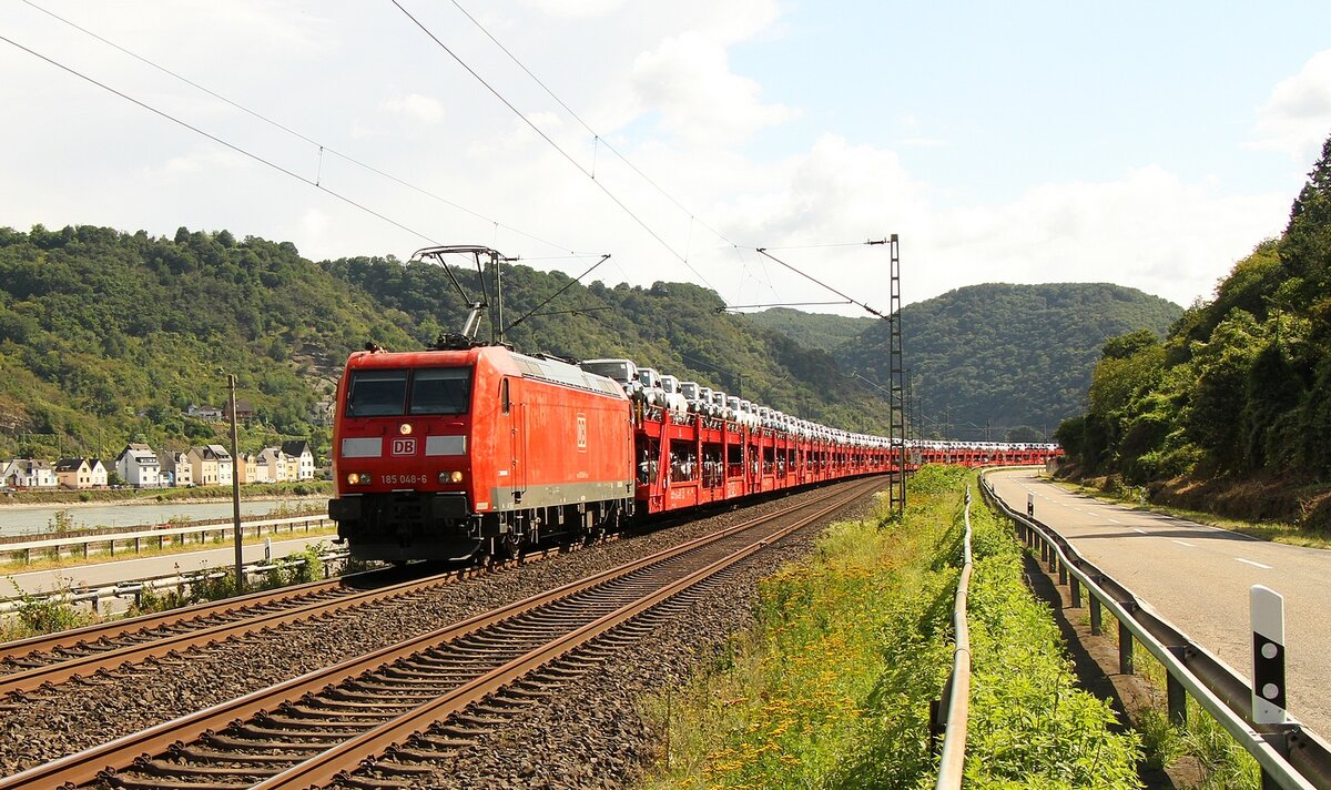 185 048 bringt SUV´s an 22.08.2021 bei Hirzenach auf der linken Rheinstrecke nordwärts.