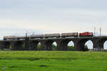 Die Elektrolokomotive 185 172-4 zog Anfang Mai 2021 einen Kesselzug über die Hochfelder Eisenbahnbrücke in Duisburg.