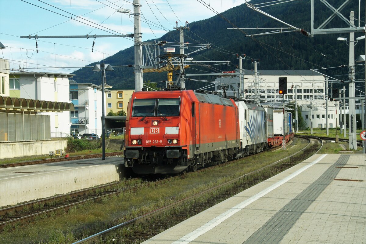DB 185 261 und Lokomotion 186 440 durchfahren mit einem Güterzug den Bahnhof Spittal-Millstättersee und wird in Kürze die Südrampe der Tauernbahn in Angriff nehmen.