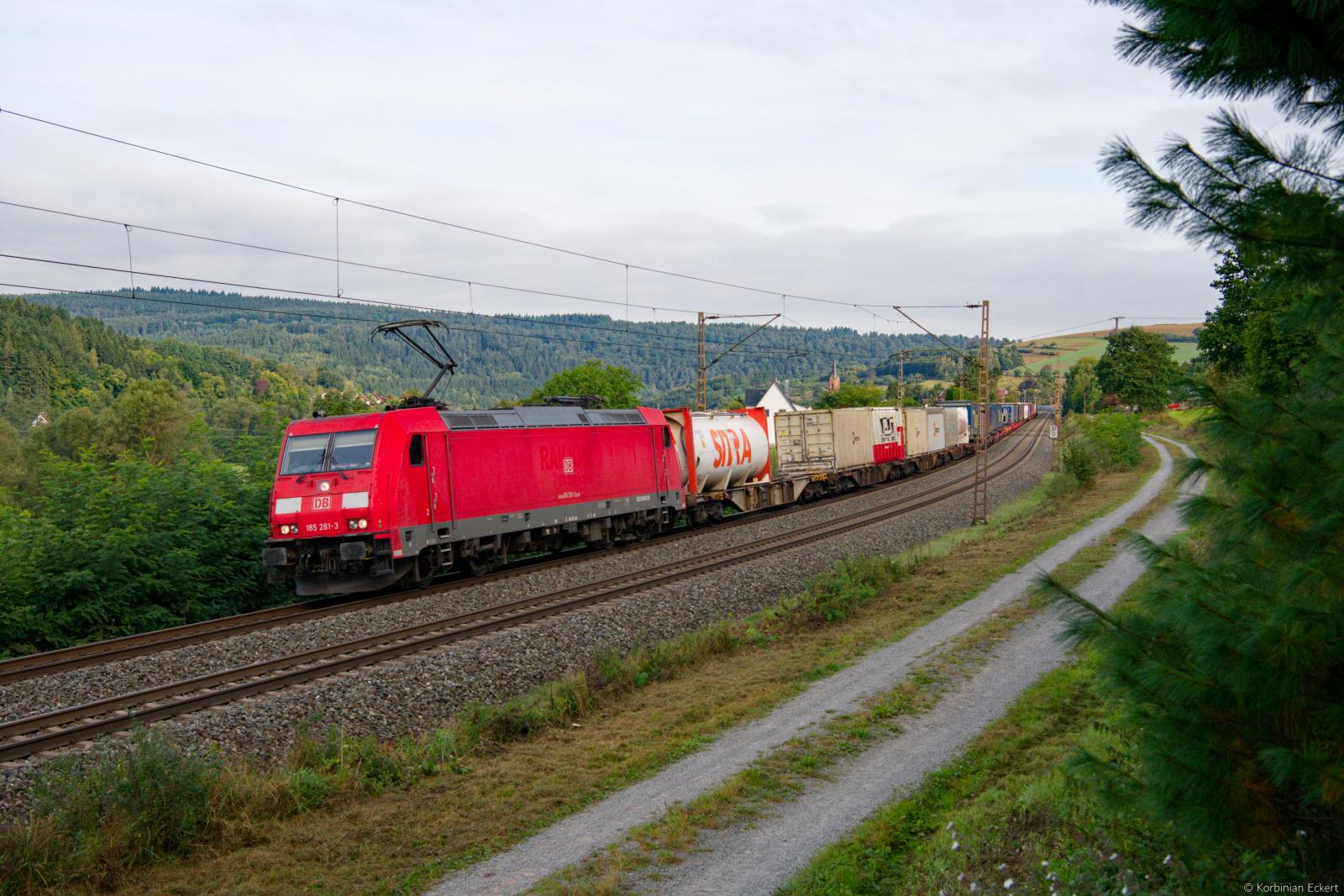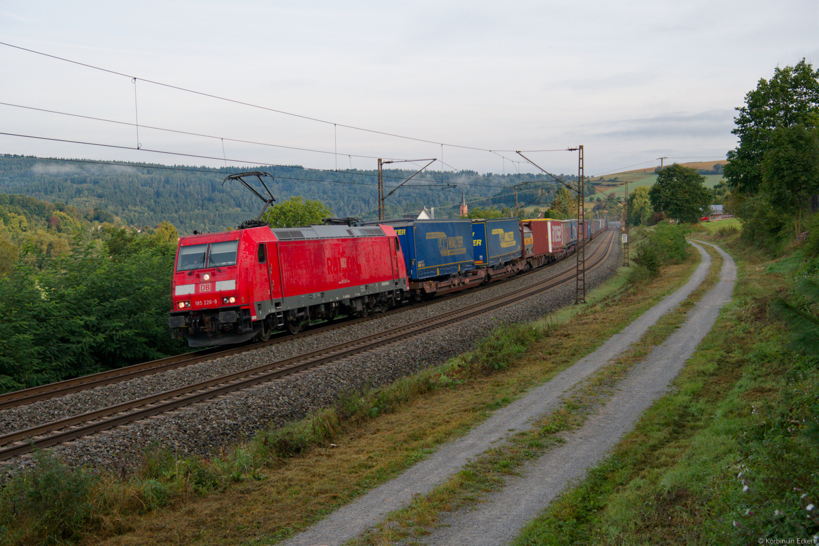 DB Cargo AG [D] mit der Doppeltraktion "185 213-6" [NVR-Nummer: 91 80 6185 213-6 D-DB] + "185 270-6" [NVR-Nummer: 91 80 6185 270-6 D-DB] mit dem Erzzug aus Hamburg Richtung Ziltendorf/EKO am 15.01.22 Durchfahrt Bf. Flughafen BER Terminal 5.