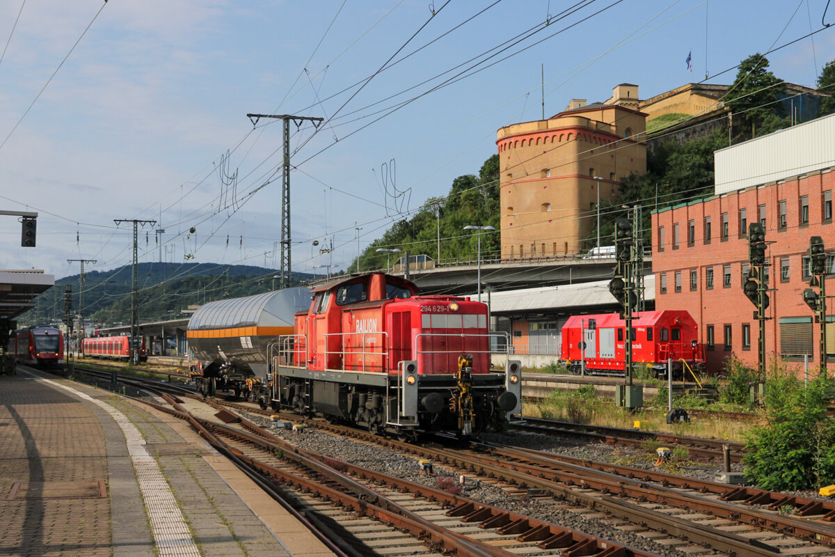 185 350 RheinCargo "Grenzenlos für Sie im Einsatz" mit einem Kesselzug bei Harrbach Richtung Würzburg, 07.10.2021