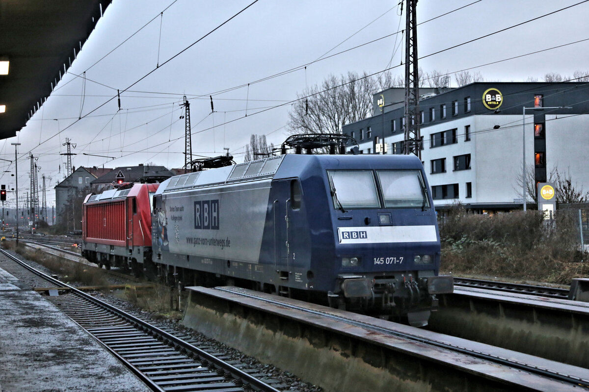 DB Cargo 185 319 durchfährt Solnhofen auf Gleis 1 Richtung Ingolstadt, während auf Gleis 3 die 145 070 der RBH wartet. Es ist die erste Zugüberholung seit dreißig Jahren, welche ich in Solnhofen beobachte. Dienstag, 12. April 2022