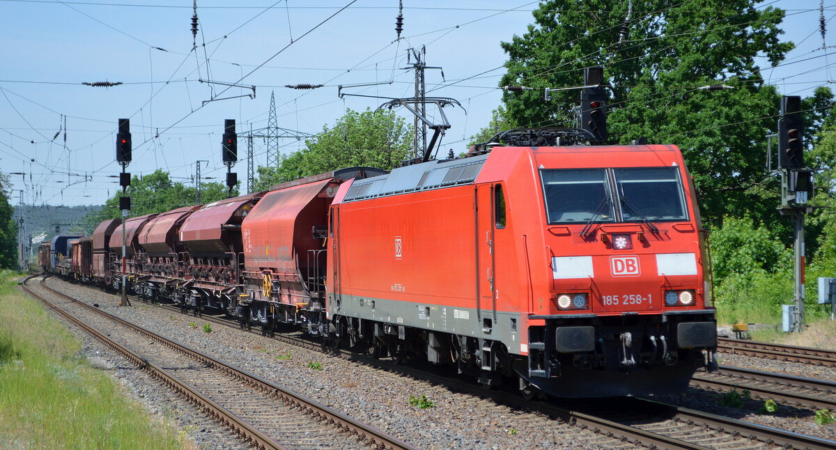 DB Cargo AG [D] mit "185 258-1" [NVR-Nummer: 91 80 6185 258-1 D-DB] und gemischtem Güterzug am 18.05.22 Durchfahrt Bf.