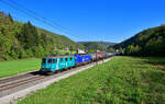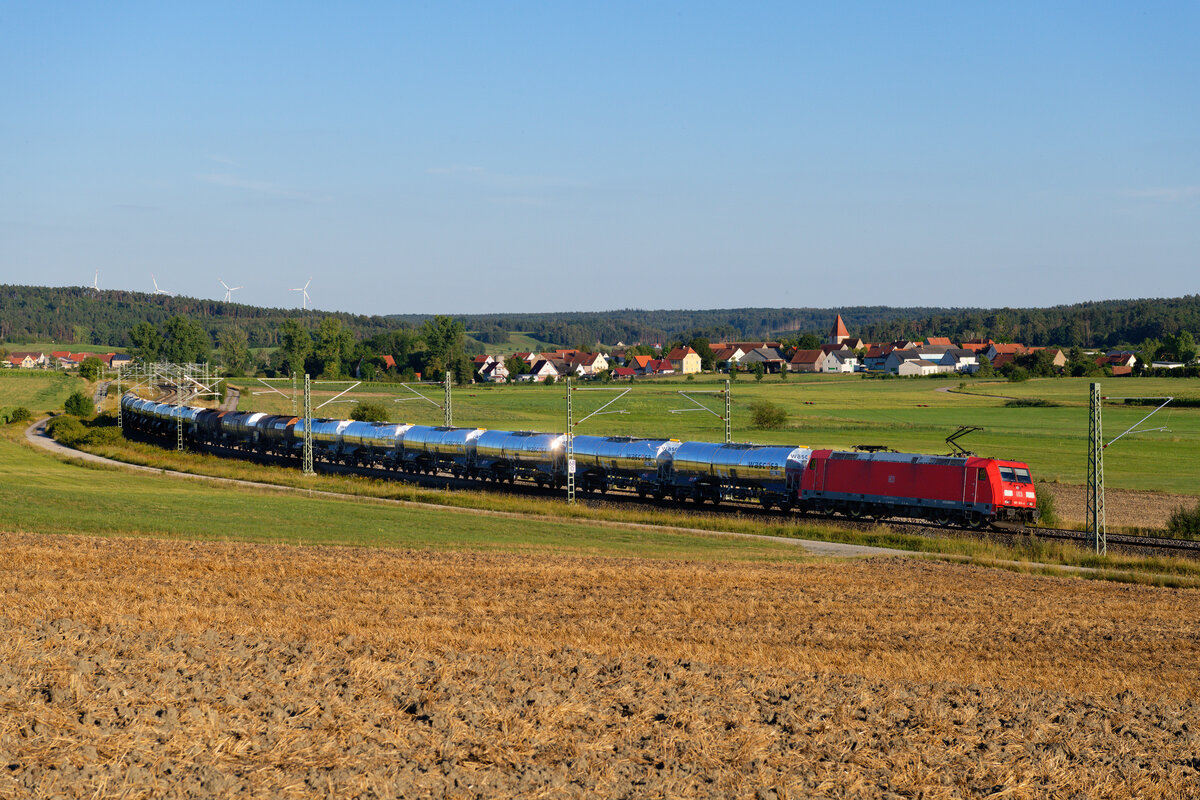 185 365 DB Cargo mit einem Kesselwagenzug bei Oberdachstetten Richtung Würzburg, 06.08.2020