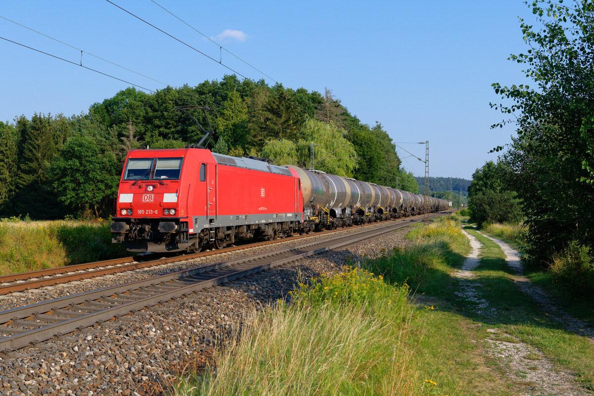 185 213 DB Cargo mit einem Kesselzug bei Postbauer-Heng Richtung Nürnberg, 09.08.2020