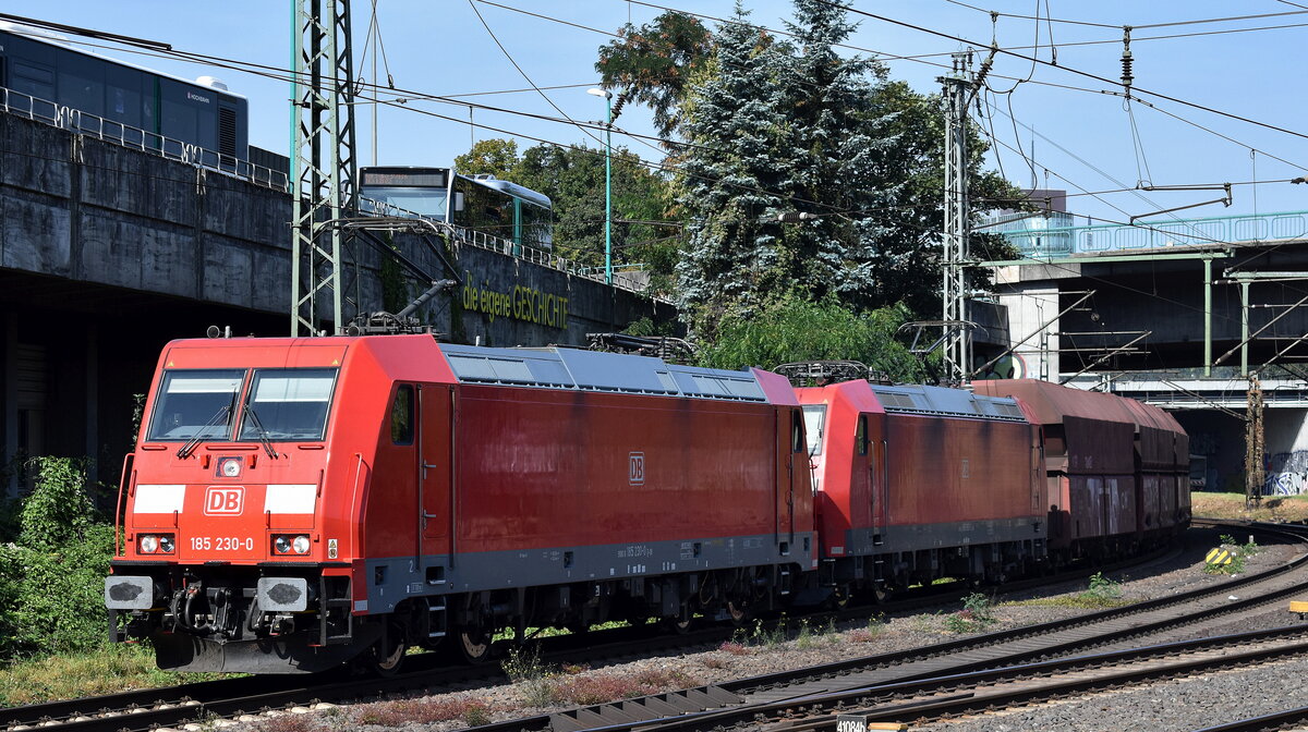 185 160 war mit einem gemischten Güterzug am 3. Mai 2022 bei Assmannshausen in Richtung Bingen unterwegs.