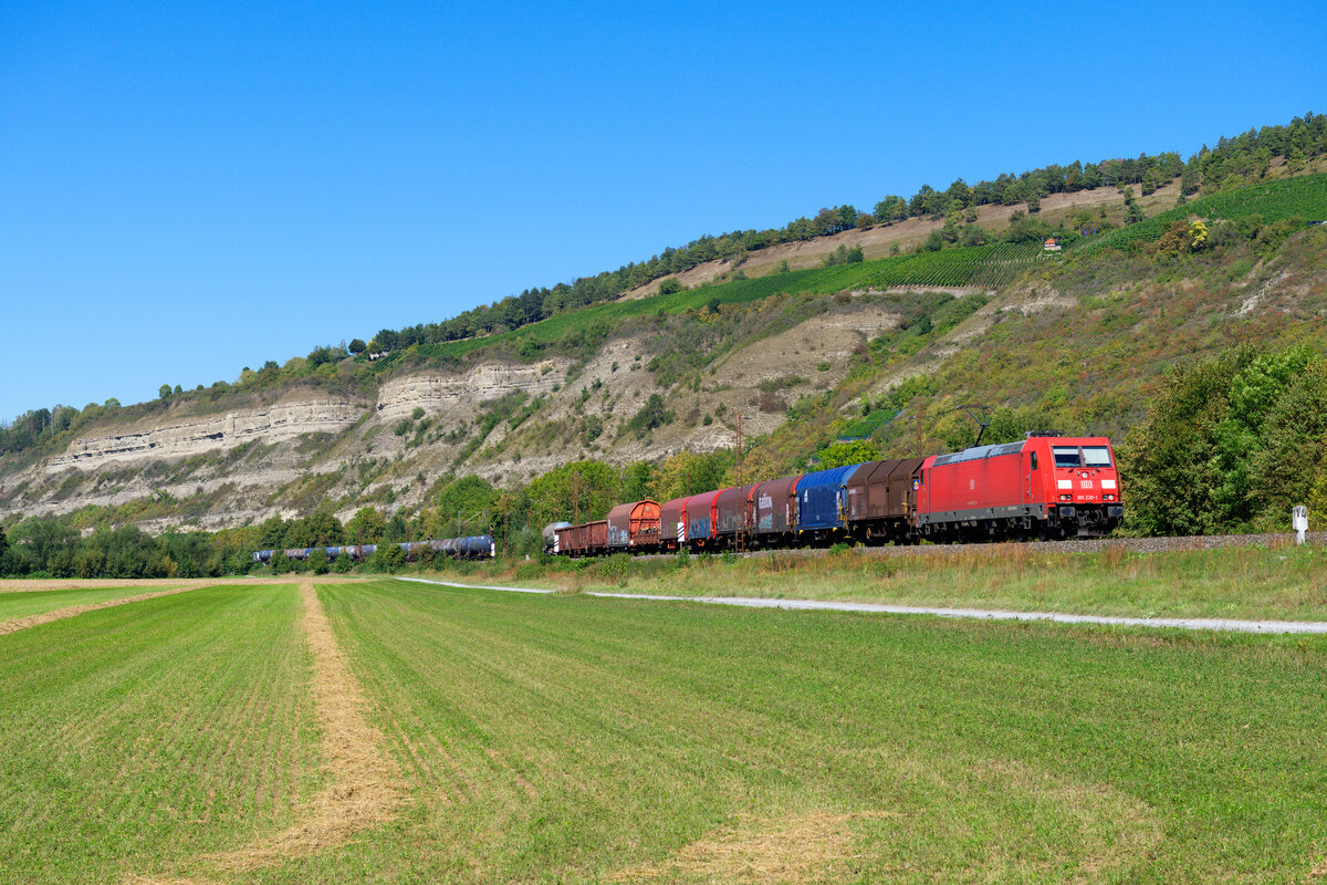 185 220 DB Cargo mit einem gemischten Güterzug bei Thüngersheim Richtung Würzburg, 09.09.2020