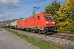 185 350 RheinCargo "Grenzenlos für Sie im Einsatz" mit einem Kesselzug bei Harrbach Richtung Würzburg, 07.10.2021