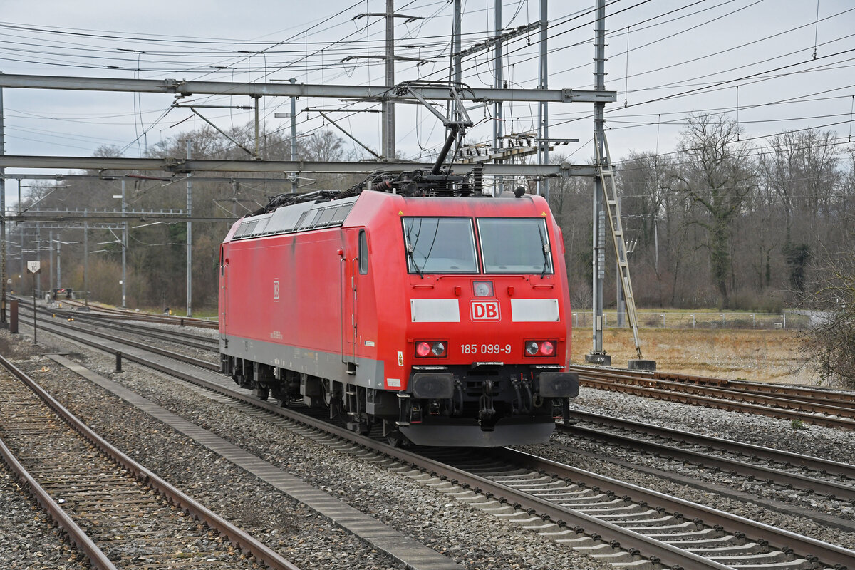 DB Lok 185 099-9 durchfährt am 17.02.2023 solo den Bahnhof Möhlin.