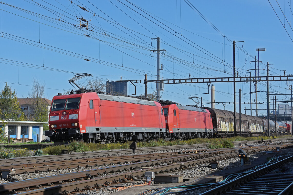 Doppeltraktion, mit den DB Loks 185 115-3 und 185 100-5 durchfährt am 25.10.2022 den Bahnhof Pratteln.