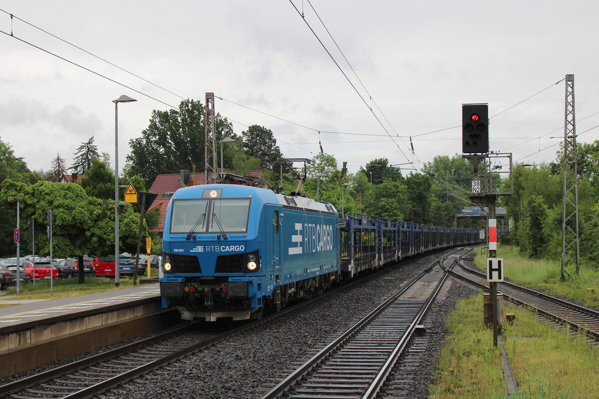 RTB Cargo 192 061 mit leeren Autotransportwagen Richtung Hannover, am 22.05.2024 in Alfeld (Leine). Vom Bahnsteig aus fotografiert.