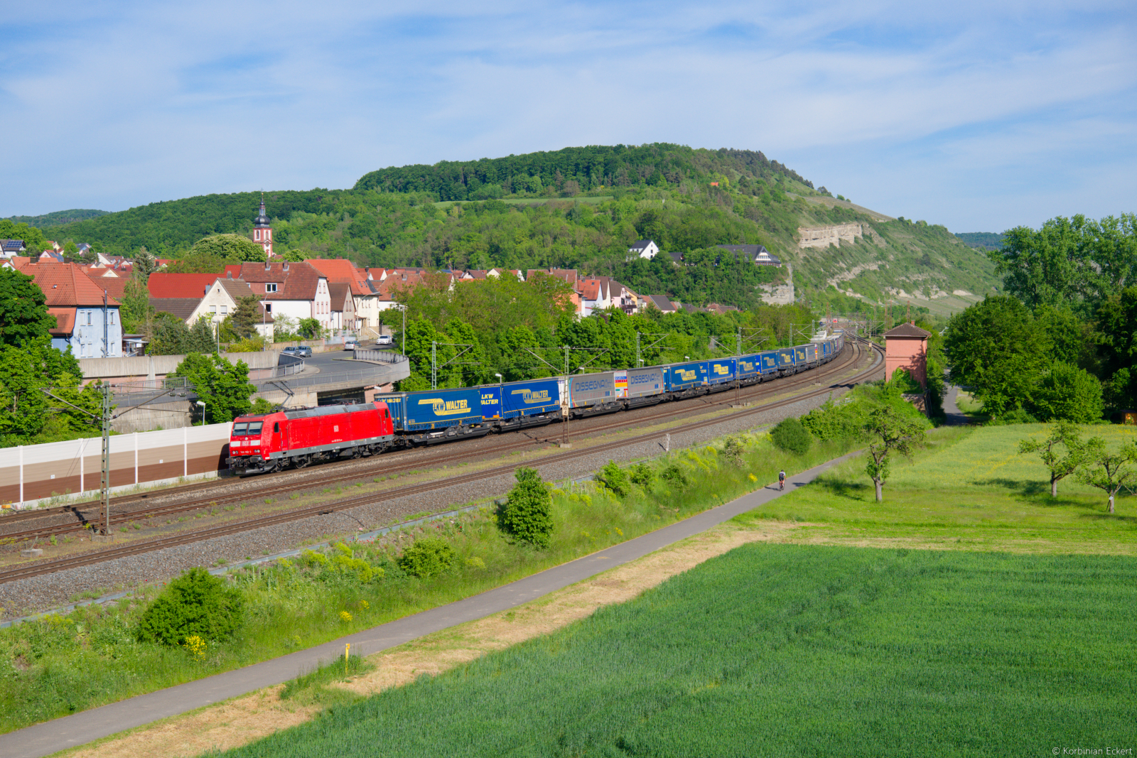185 192 DB Cargo mit einem LKW-Walter KLV-Zug bei Retzbach-Zellingen Richtung Gemünden, 01.06.2021