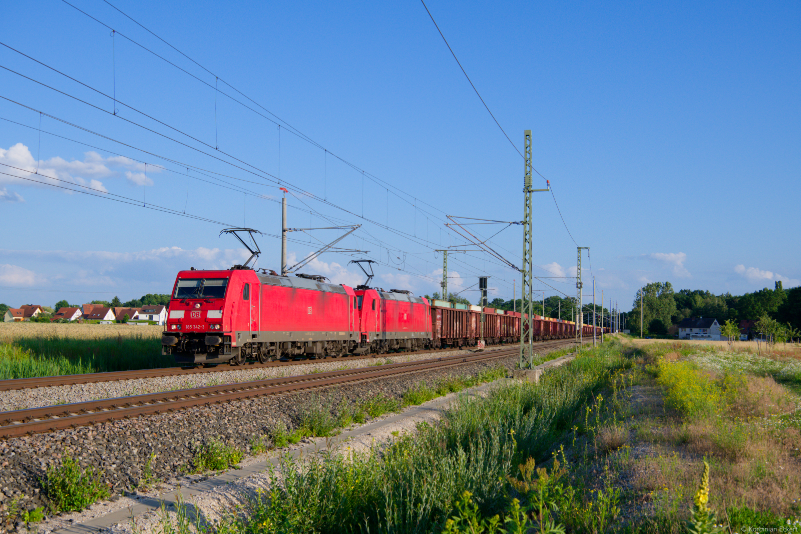 185 342 DB Cargo und 185 221 DB Cargo mit Containern in Ea-Wagen bei Eltersdorf Richtung Bamberg, 02.07.2021