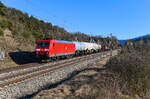 Mit einem schön gebildeten gemischten Güterzug war am 05. März 2025 die Frankreich-taugliche 185 033 bei Hagenacker im Altmühltal in Fahrtrichtung Treuchtlingen unterwegs.
