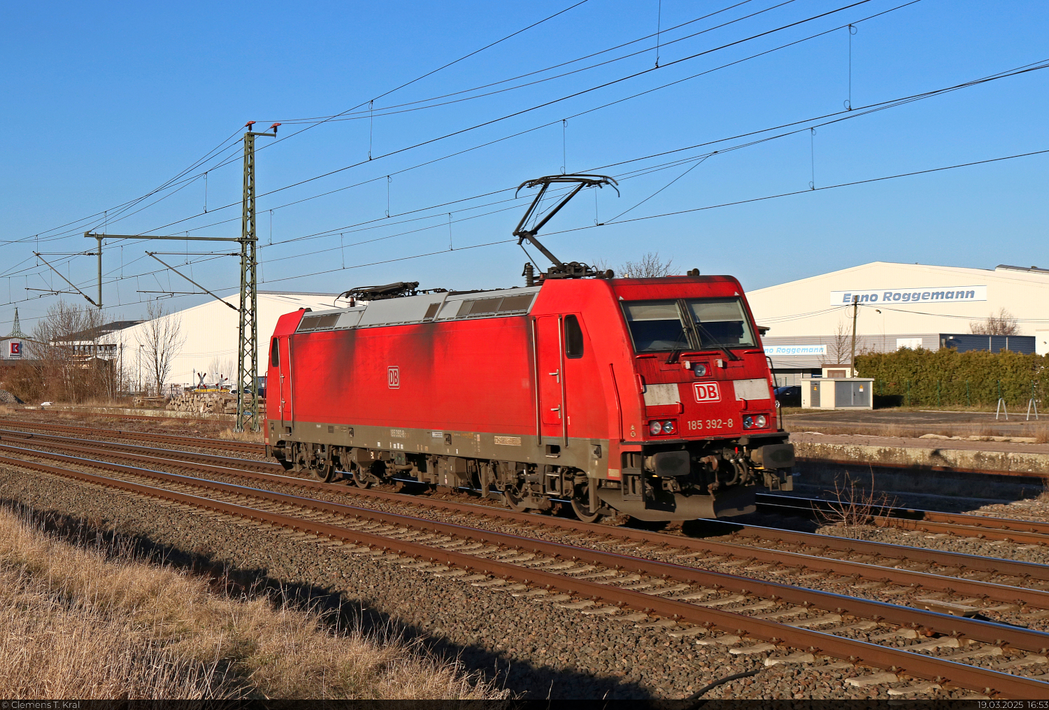 Die sehr saubere und in südliche Richtung fahrende 185 009-8 konnte solo vom Bahnsteig 12/13 in Halle(Saale)Hbf beobachtet werden. 🧰 DB Cargo 🕓 19.3.2025 | 14:46 Uhr